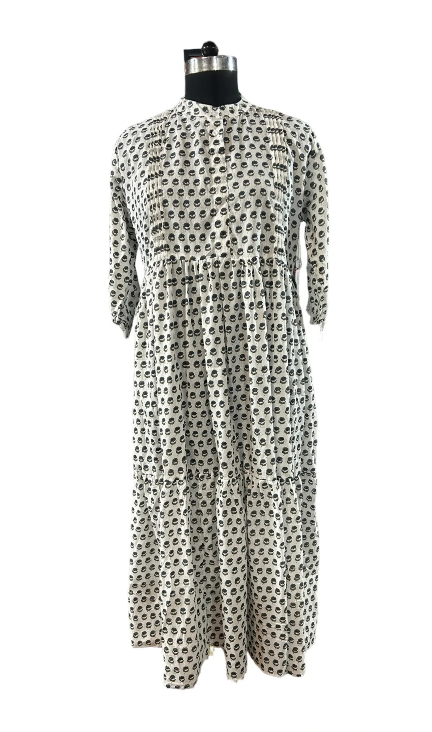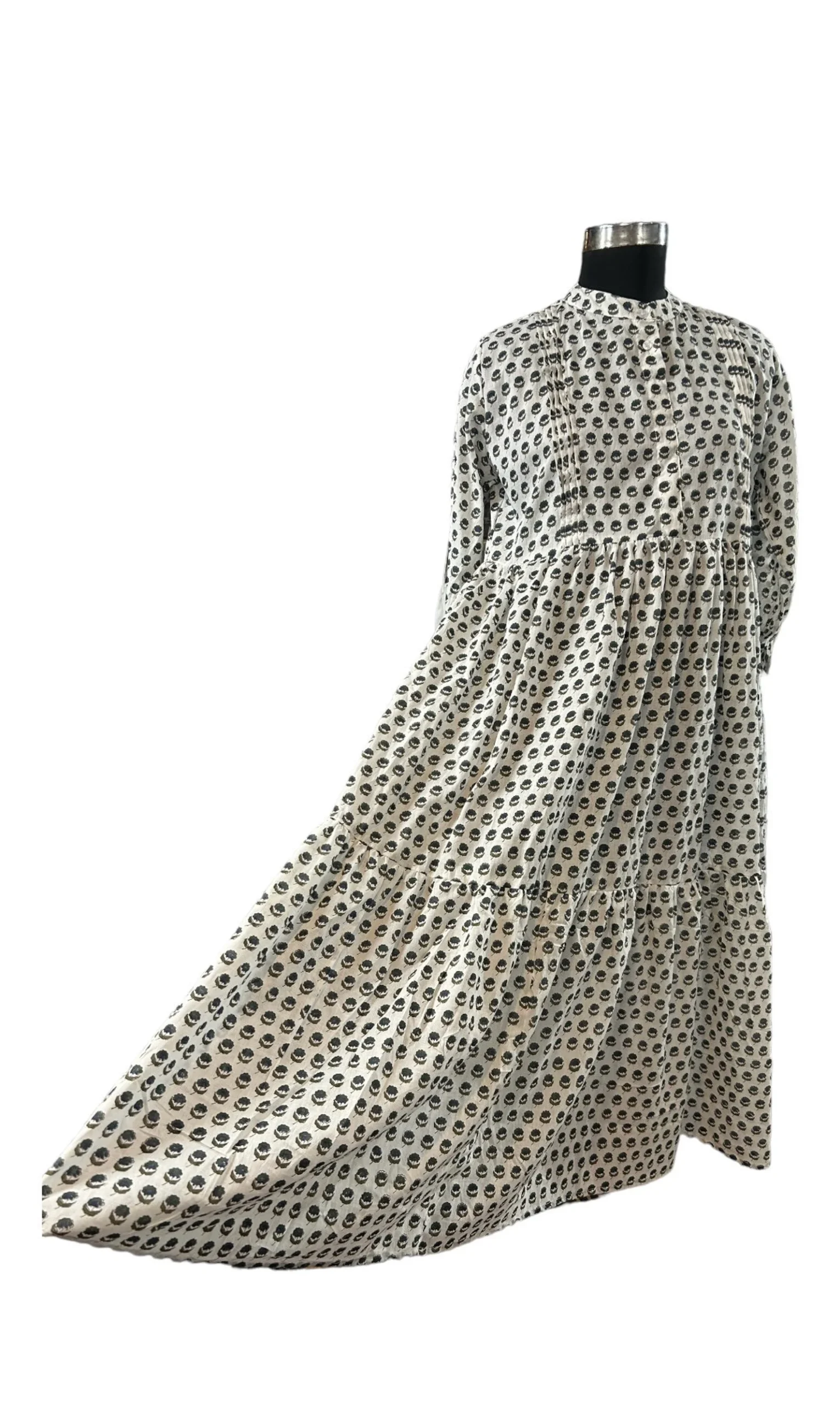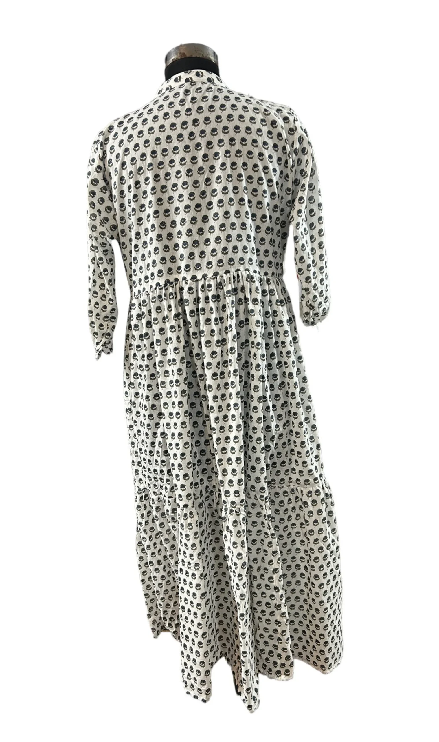 Hand block printed indigo blue floral print long dress 100 % organic cotton and made with natural colours and made to use in any weather long dress shirt collar design dress and the