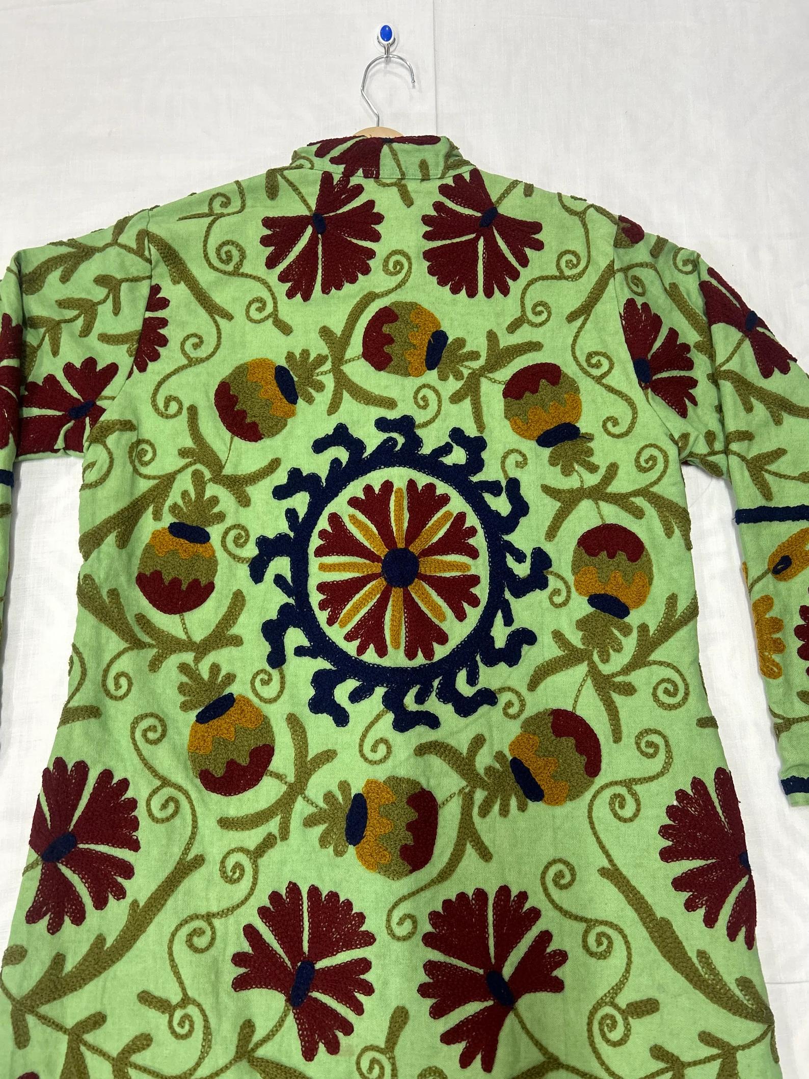 Suzani Hand Embroidery Long Jacket For Man And Woman Green Colour In Floral Design